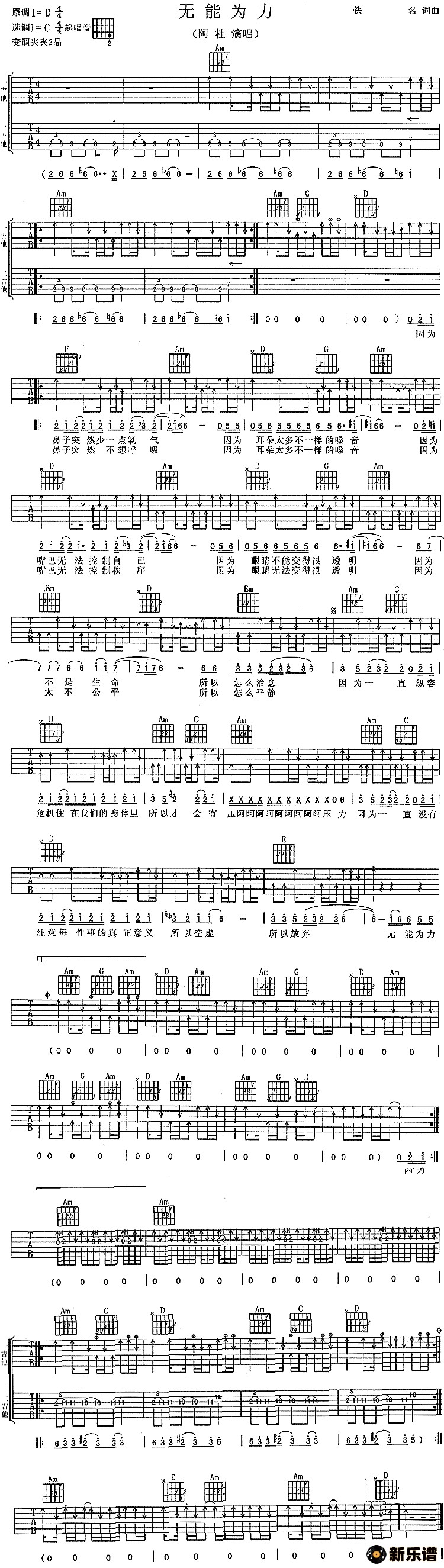 阿杜演唱的无能为力歌词,无能为力吉他谱.