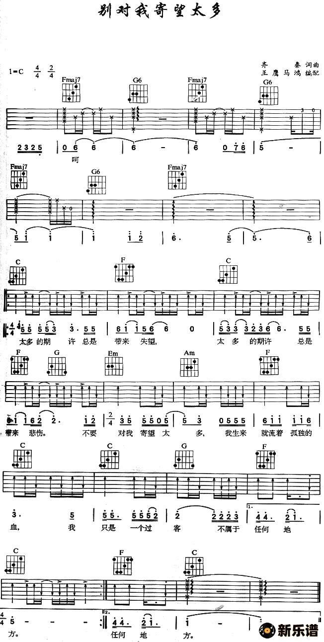 齐秦演唱的别对我寄望太多歌词,别对我寄望太多吉他谱.
