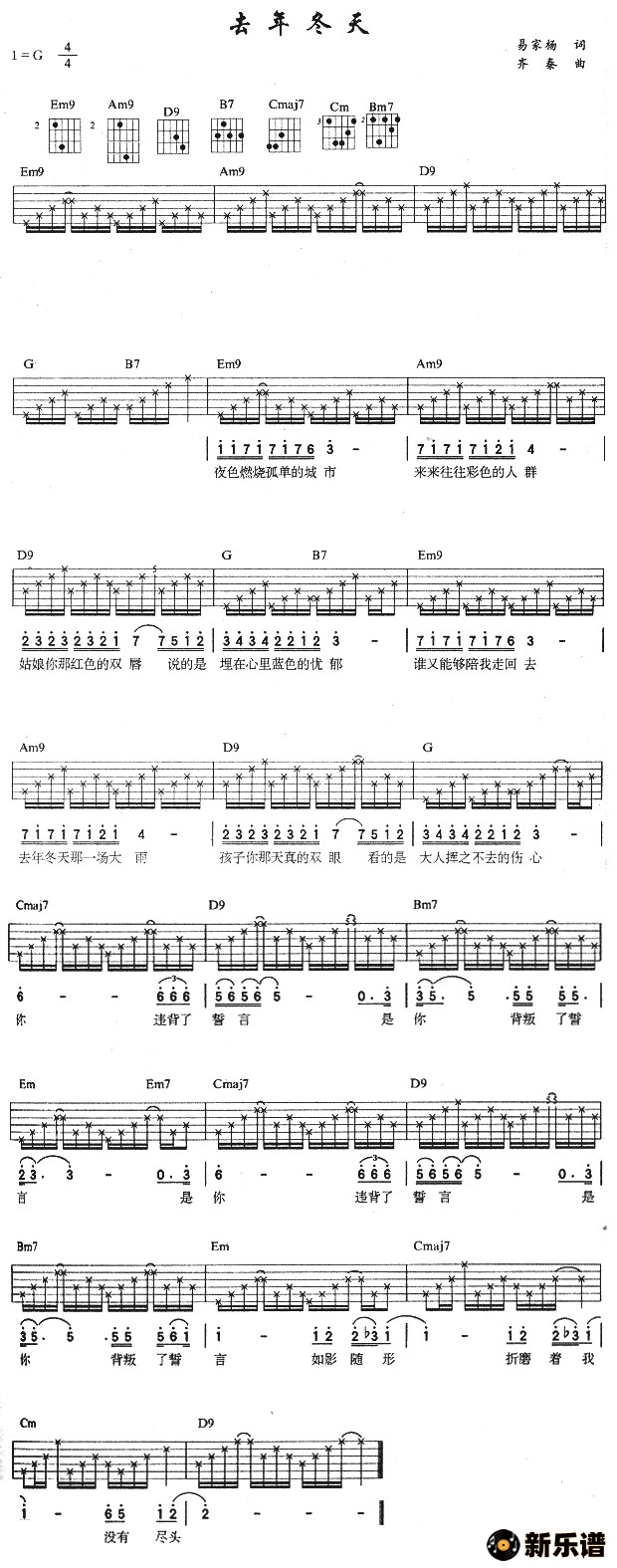齐秦演唱的去年冬天歌词,去年冬天吉他谱.