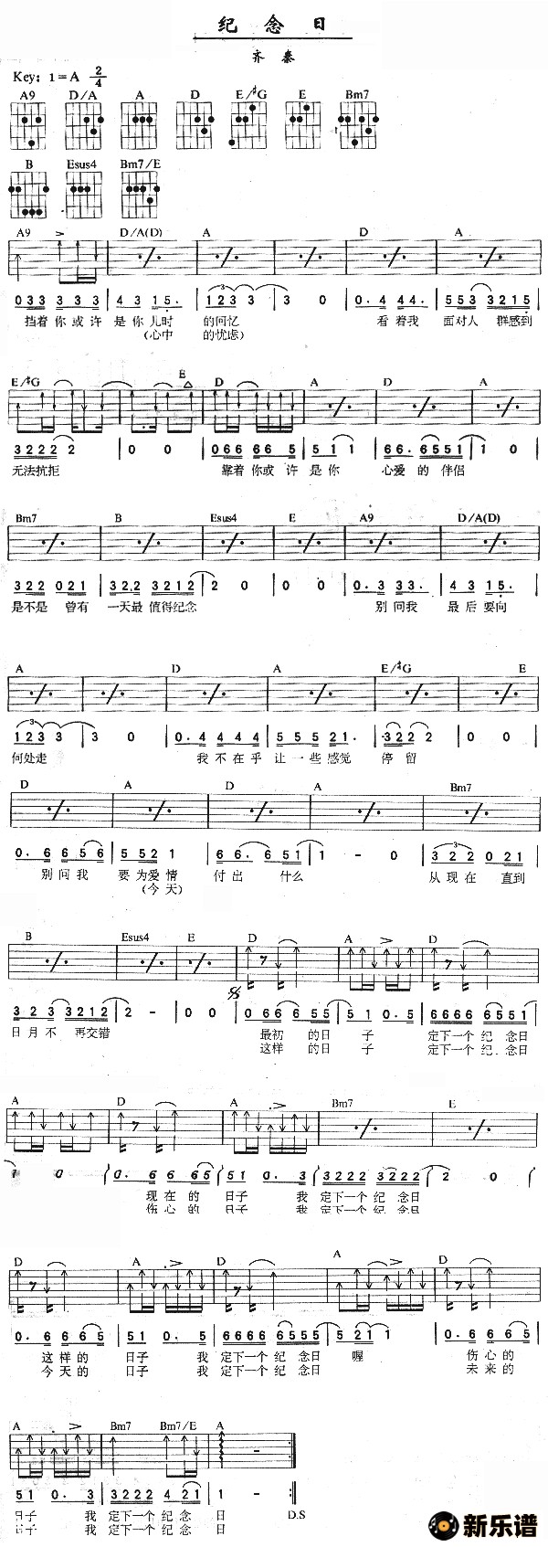齐秦演唱的纪念日歌词,纪念日吉他谱.