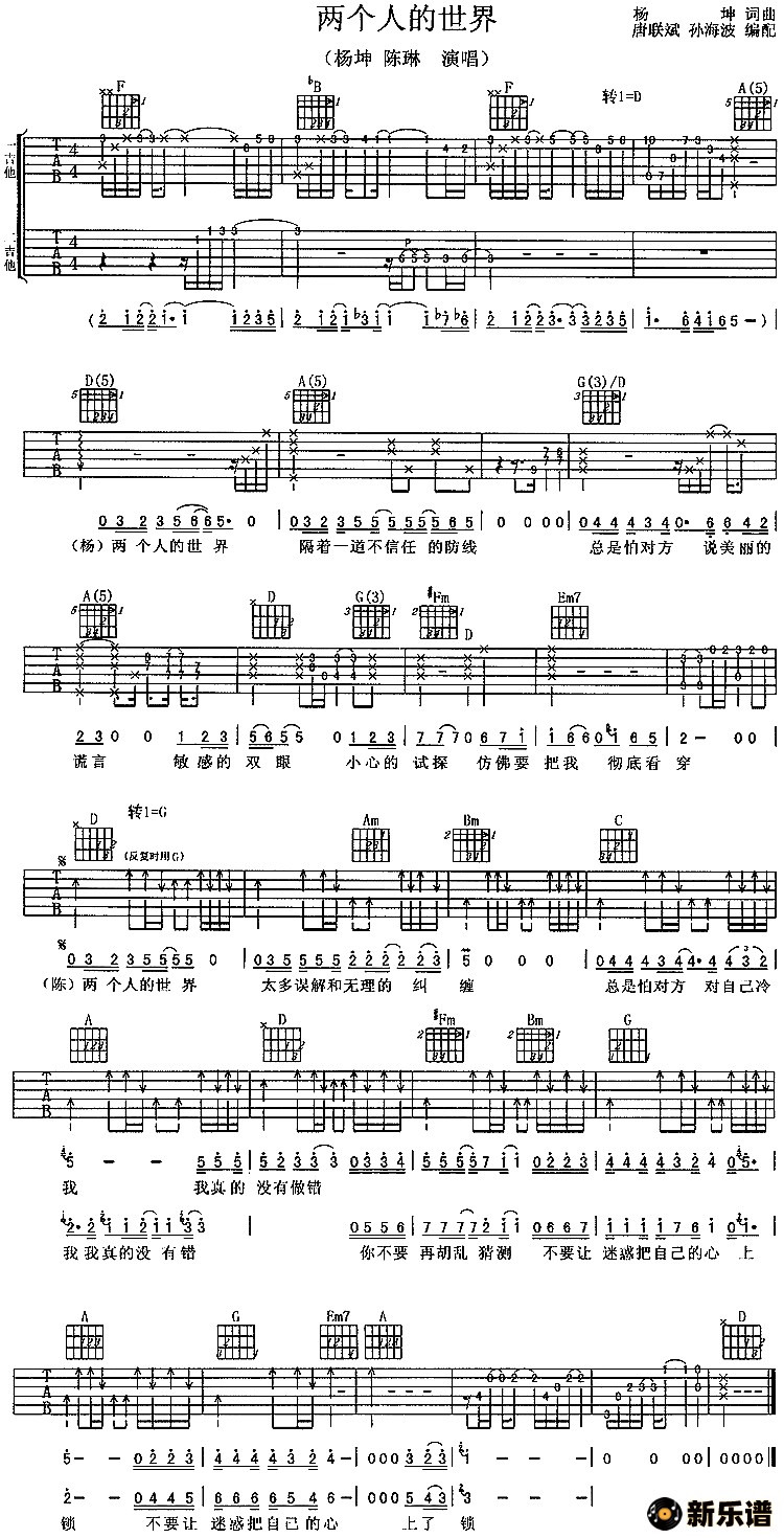 杨坤演唱的两个人的世界歌词,两个人的世界吉他谱.