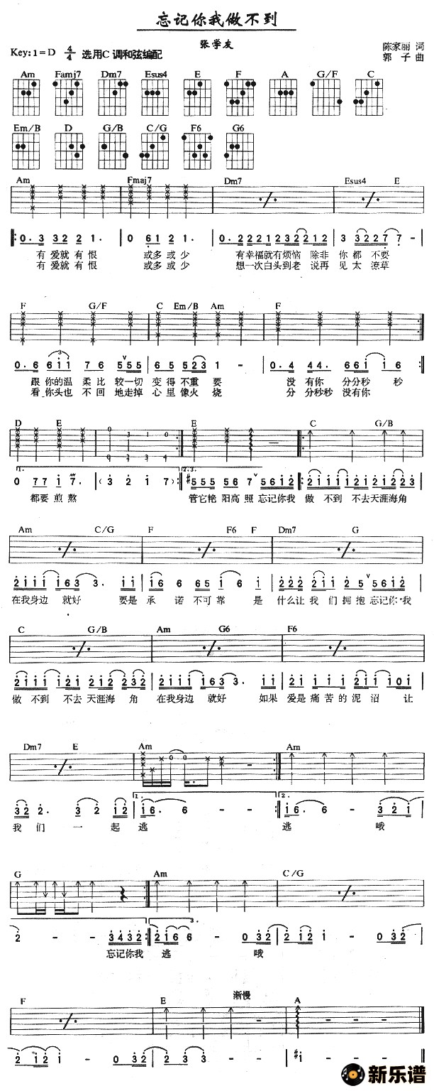 张学友演唱的忘记你我做不到歌词,忘记你我做不到吉他谱.