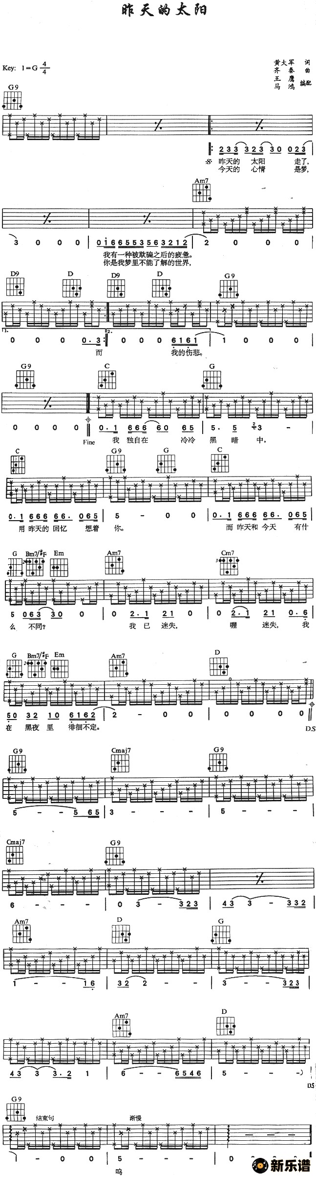 齐秦演唱的昨天的太阳歌词,昨天的太阳吉他谱.