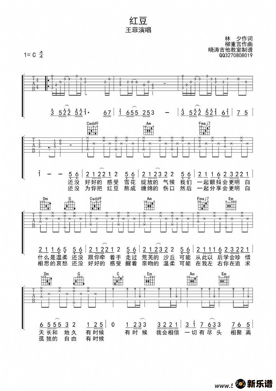 王菲演唱的红豆歌词,红豆吉他谱.