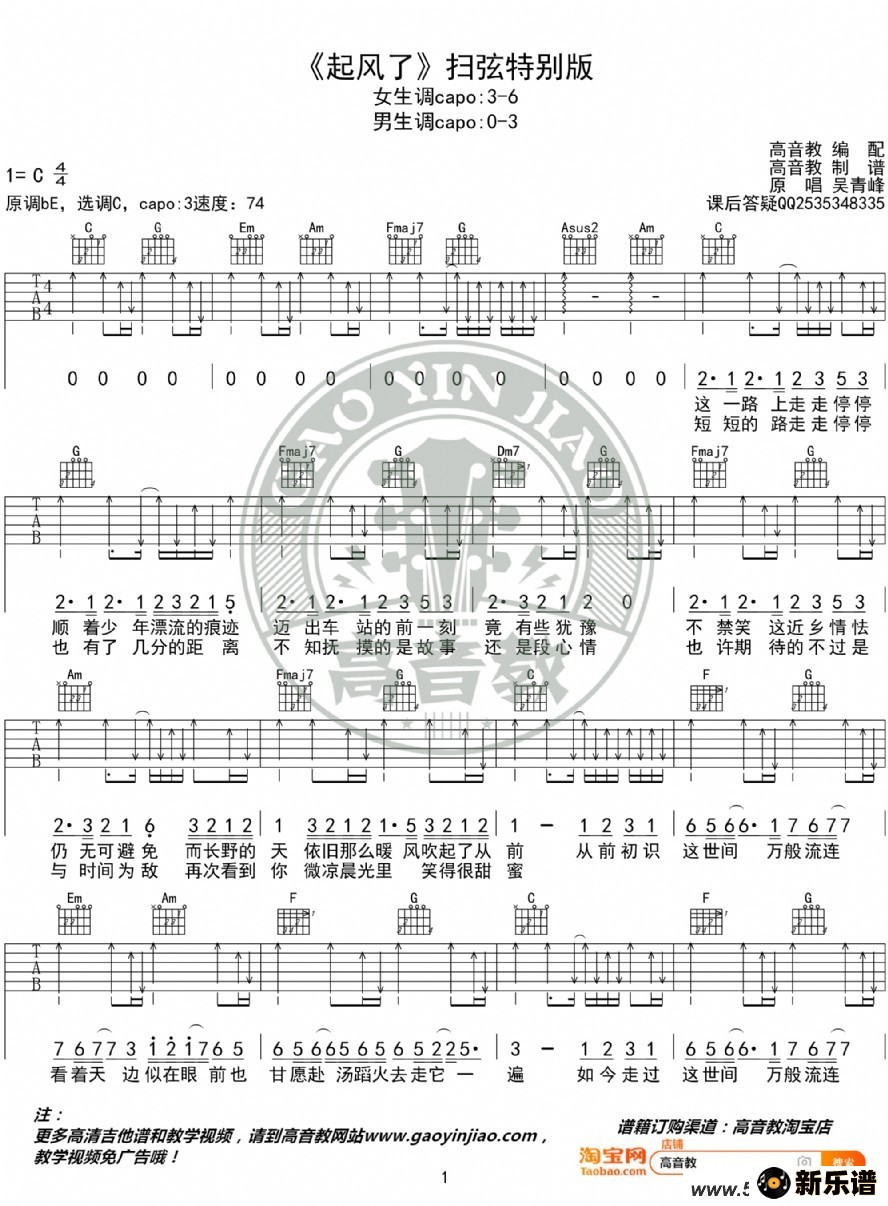 《起风了》吉他谱扫弦特别版 吴青峰 高音教编配吉他谱