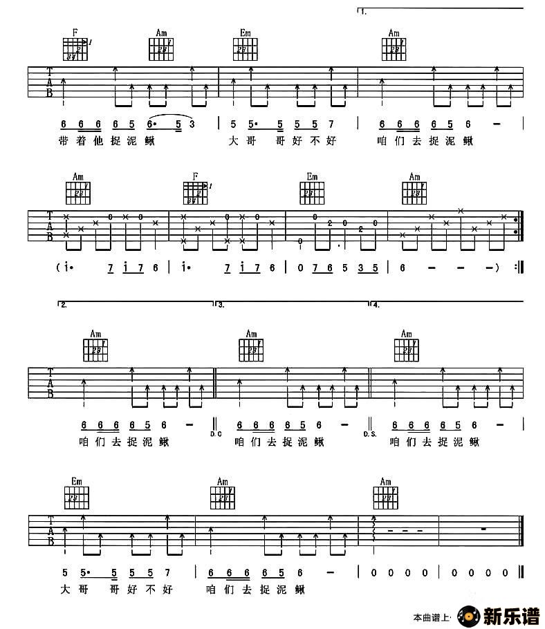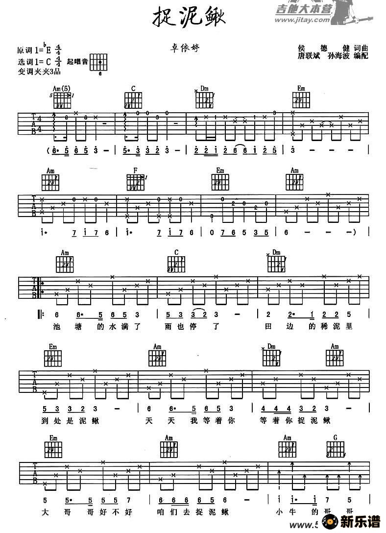 卓依婷演唱的捉泥鳅歌词,捉泥鳅吉他谱.