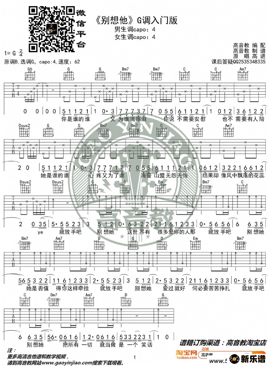 《别想他》吉他谱g调入门版 抖音热曲 高音教编配高进 高进演唱的《别想他》吉他谱g调入门版 抖音热曲 高音教编配歌词,《别想他》吉他谱g调入门版 抖音热曲 高音教编配吉他谱. 此吉他谱由新乐谱会员 高音教 上传