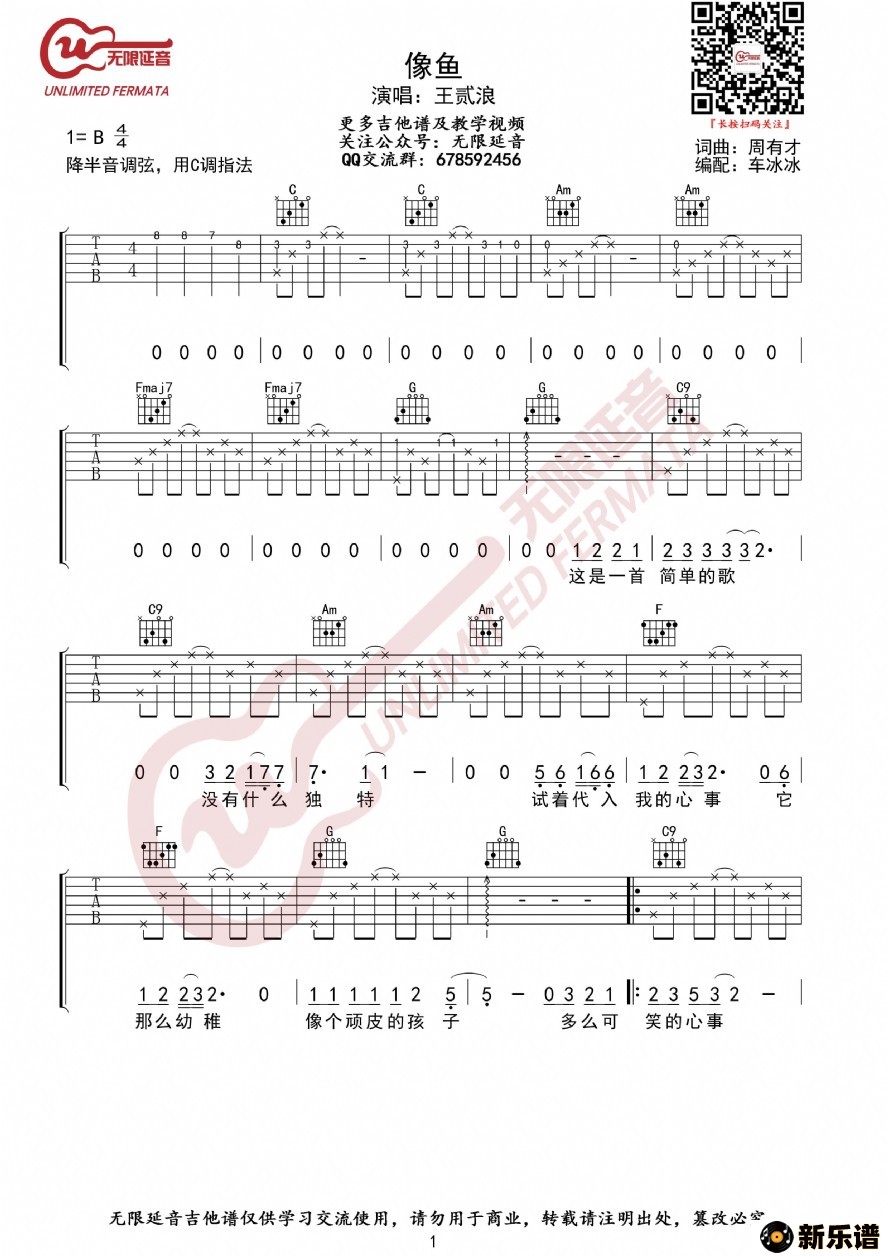 王贰浪《像鱼》吉他谱 g调弹唱六线谱吉他谱