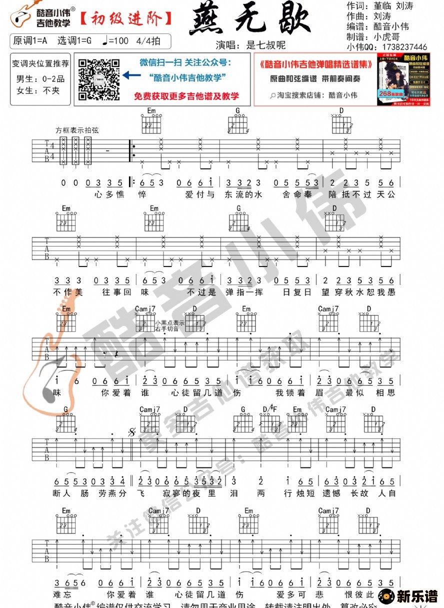 是七叔呢演唱的《燕无歇》吉他谱初级进阶版歌词,《燕无歇》吉他谱初级进阶版吉他谱.