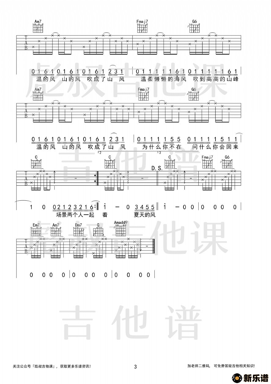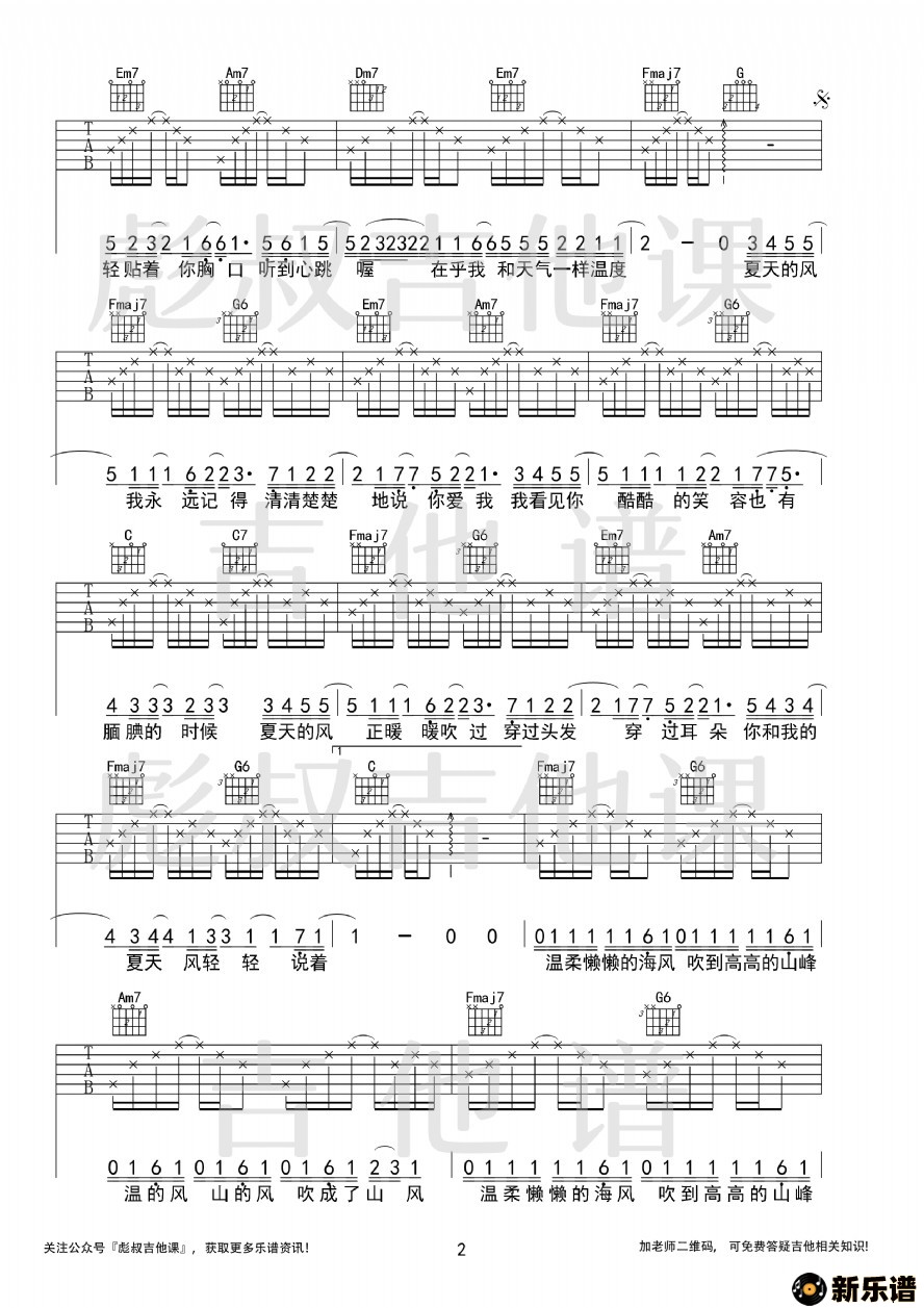 温岚—《夏天的风》c调弹唱六线谱