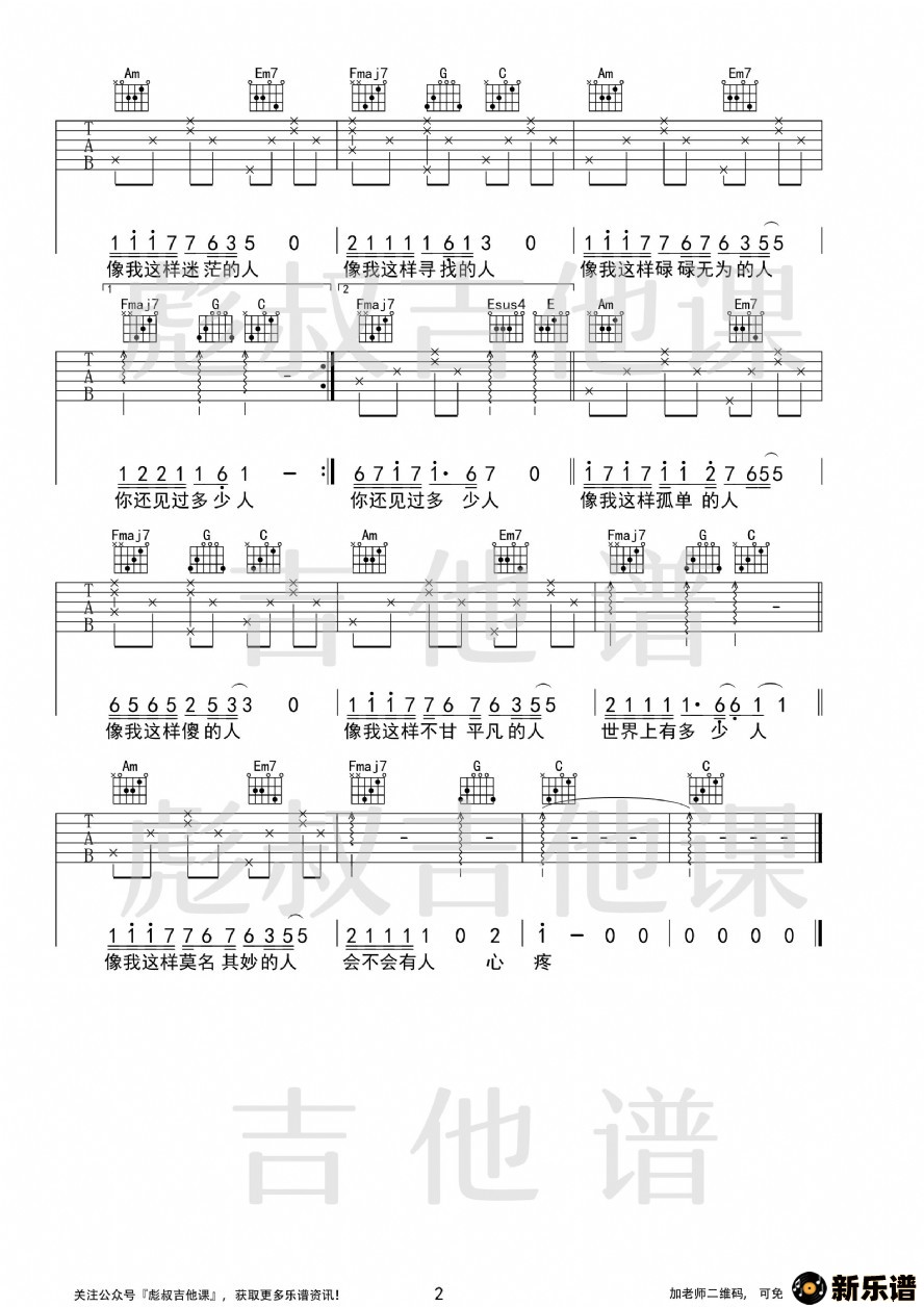 > 毛不易—《像我这样的人》c调弹唱六线谱吉他谱