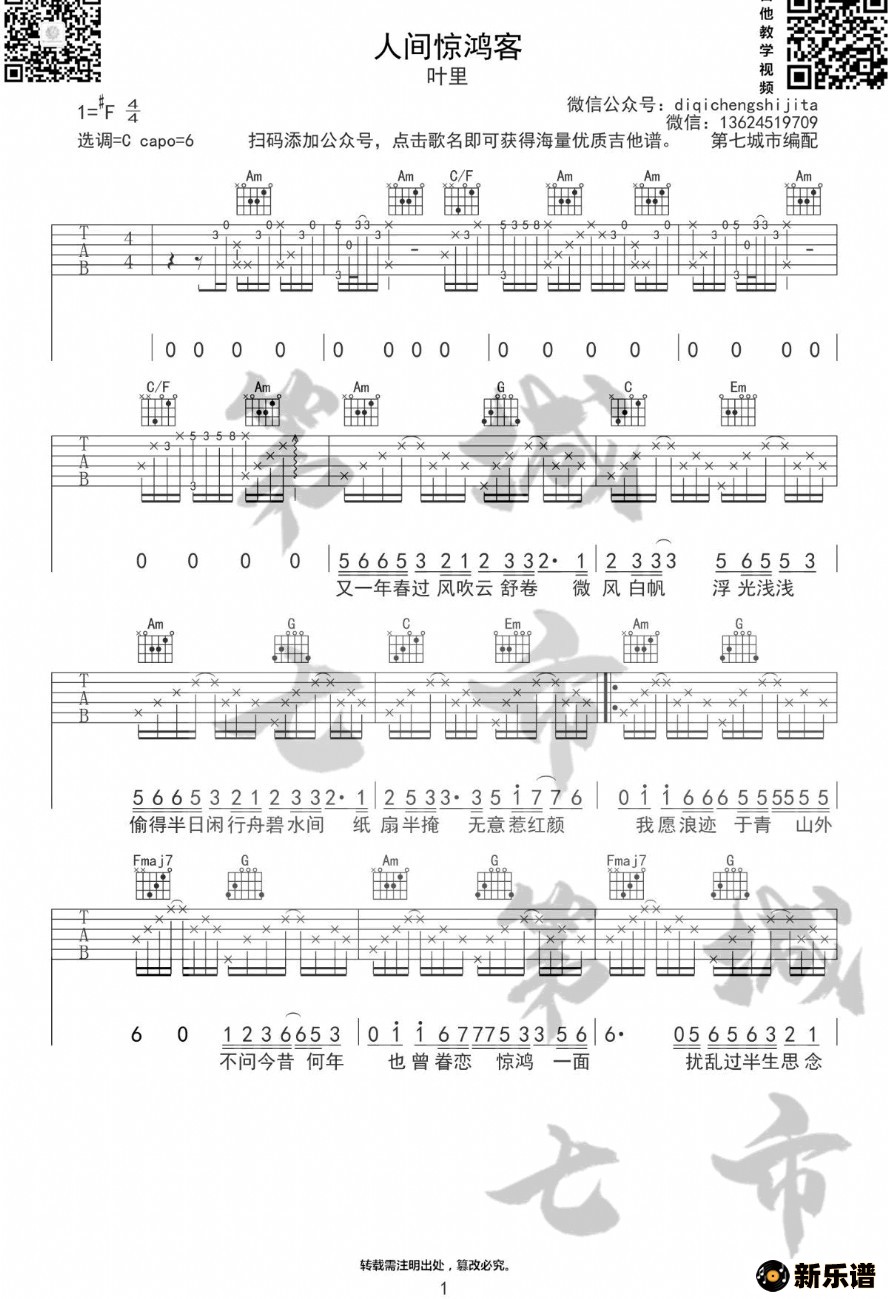 《人间惊鸿客》吉他谱 叶里-第七城市制谱