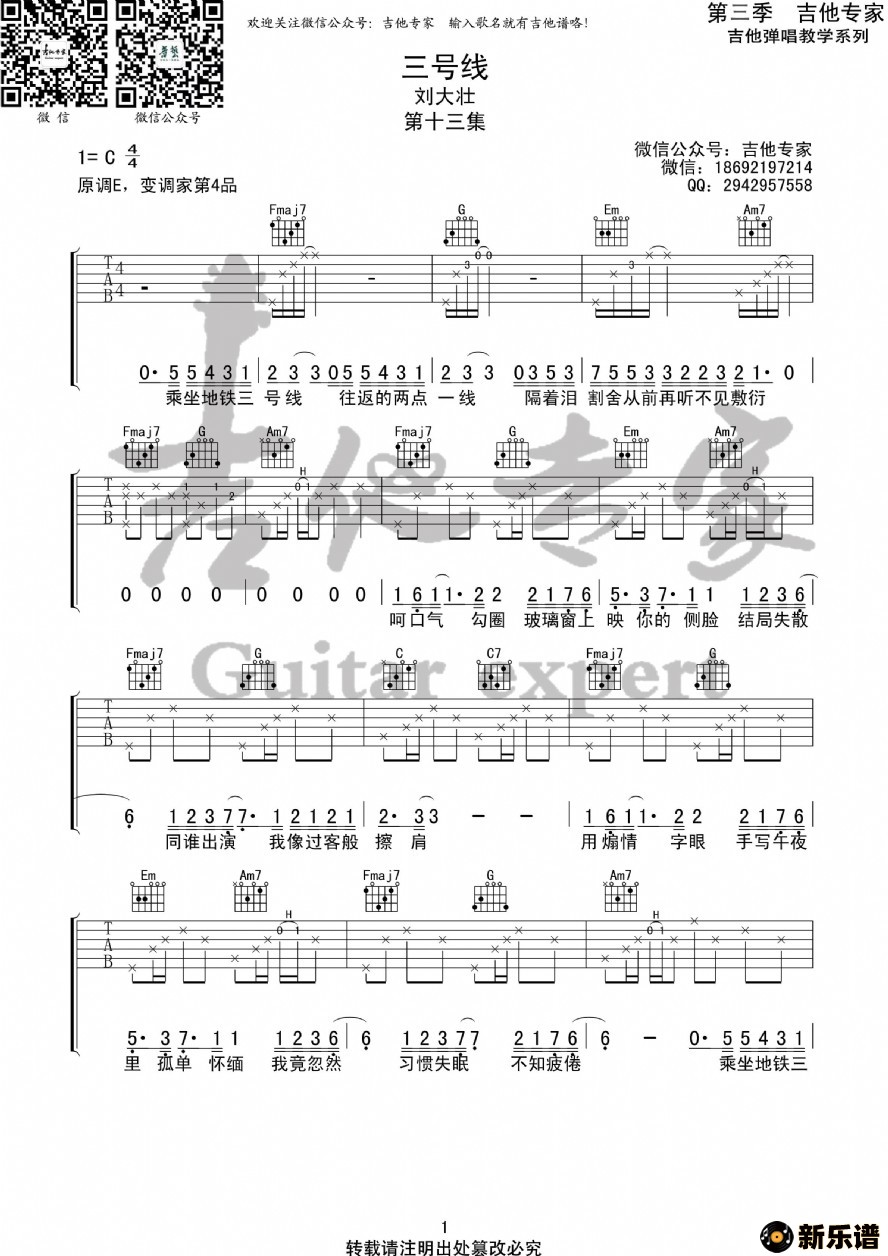 演唱的三号线 原版吉他谱歌词,三号线 原版吉他谱吉他谱.