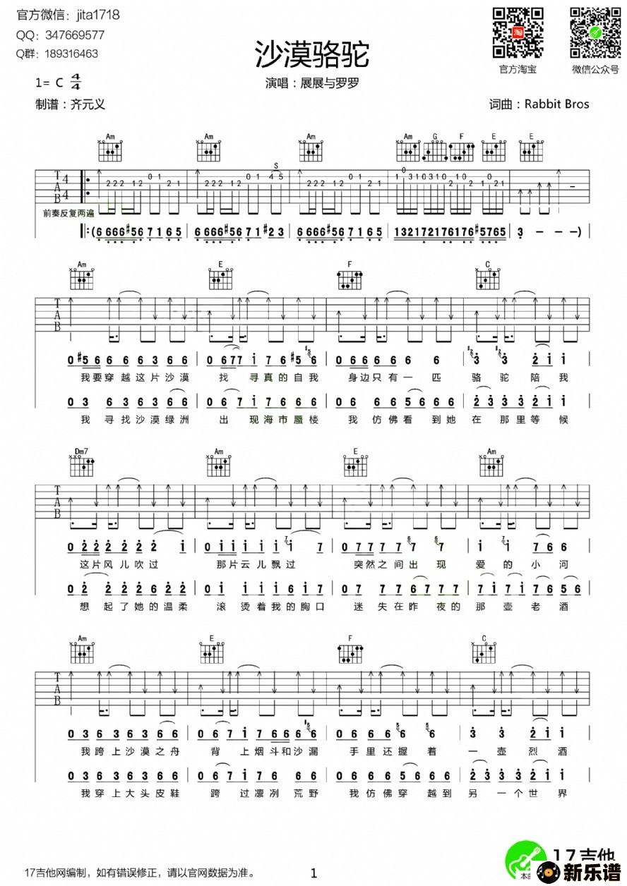 《沙漠骆驼》吉他谱c调入门高清版 展展与罗罗 高音教编配吉他谱