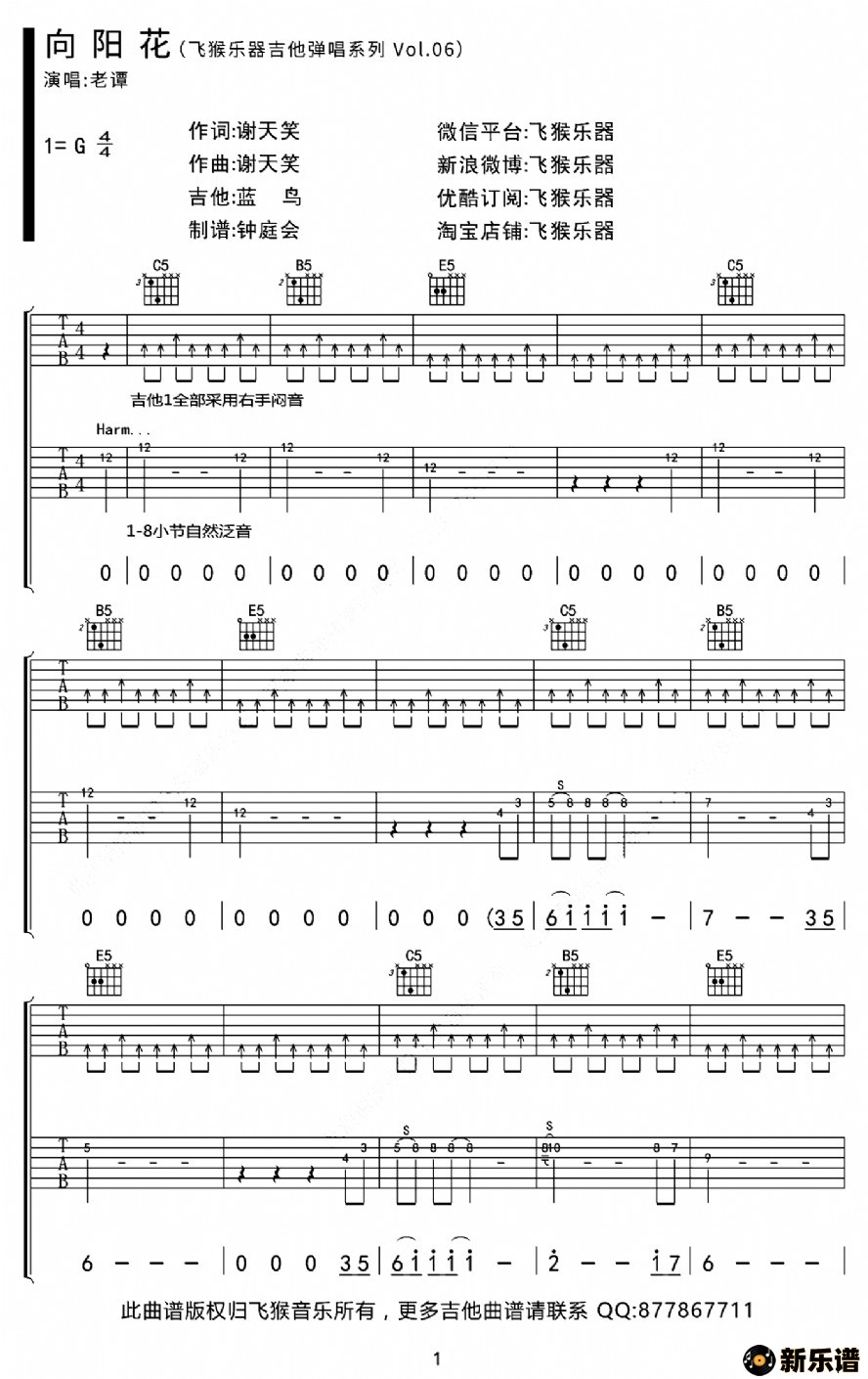 《向阳花》吉他谱 谢天笑