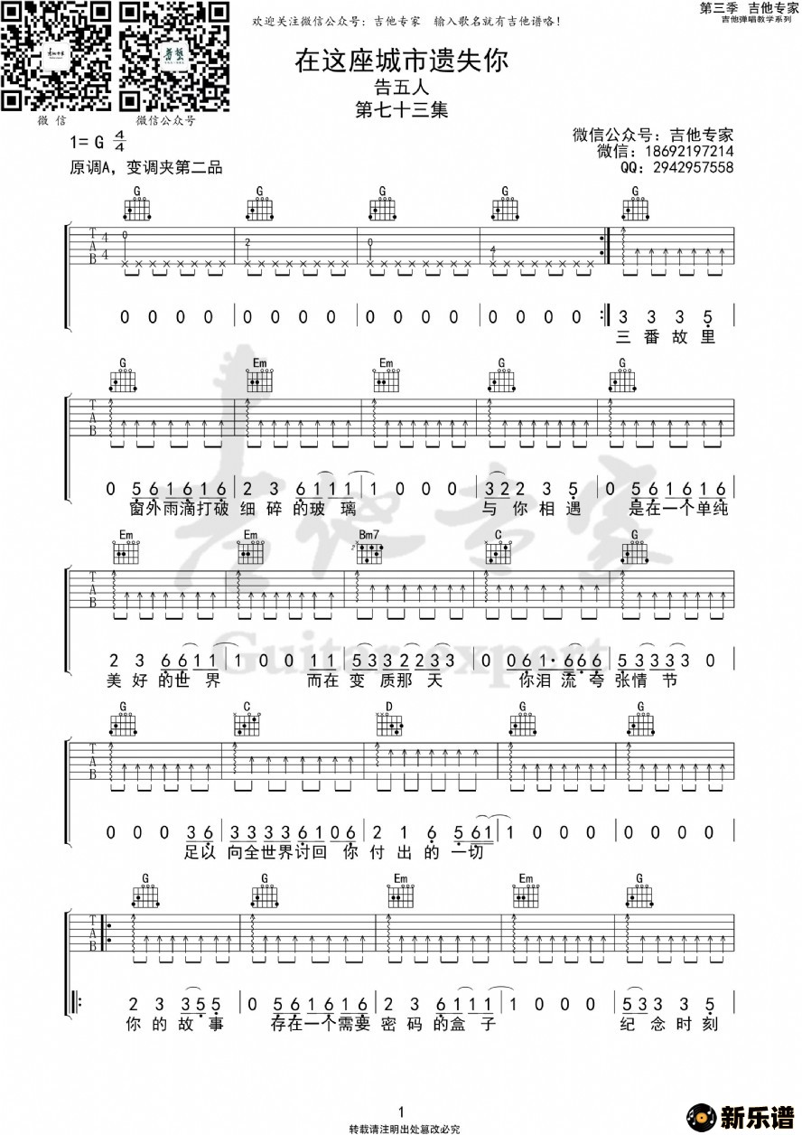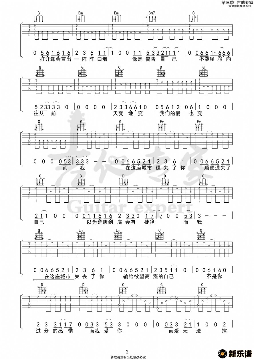 《在这座城市遗失了你》吉他谱 -吉他专家制谱