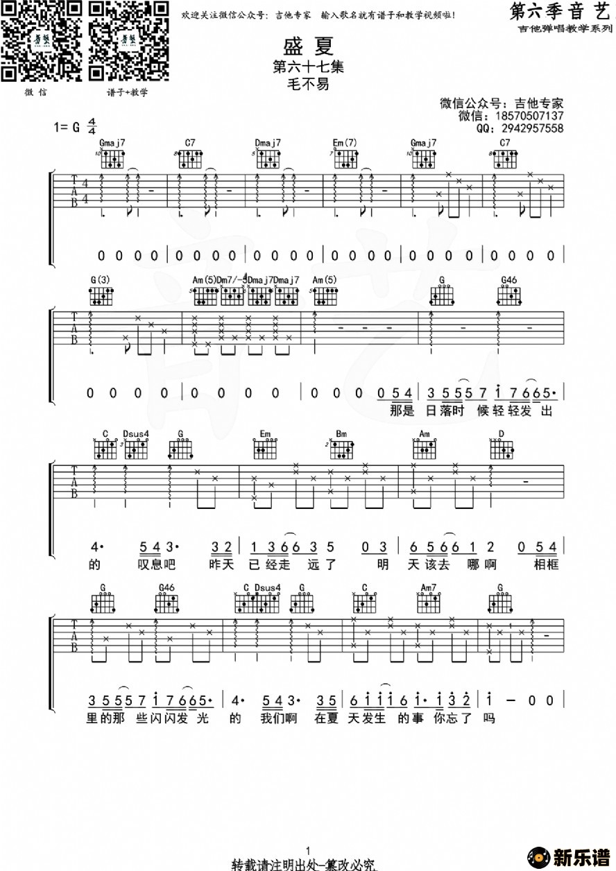 《盛夏》吉他谱 毛不易-吉他专家制谱