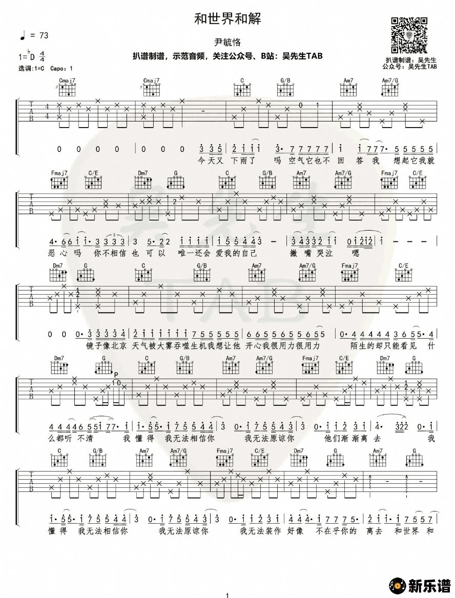 尹毓恪演唱的和世界和解歌词,和世界和解吉他谱.