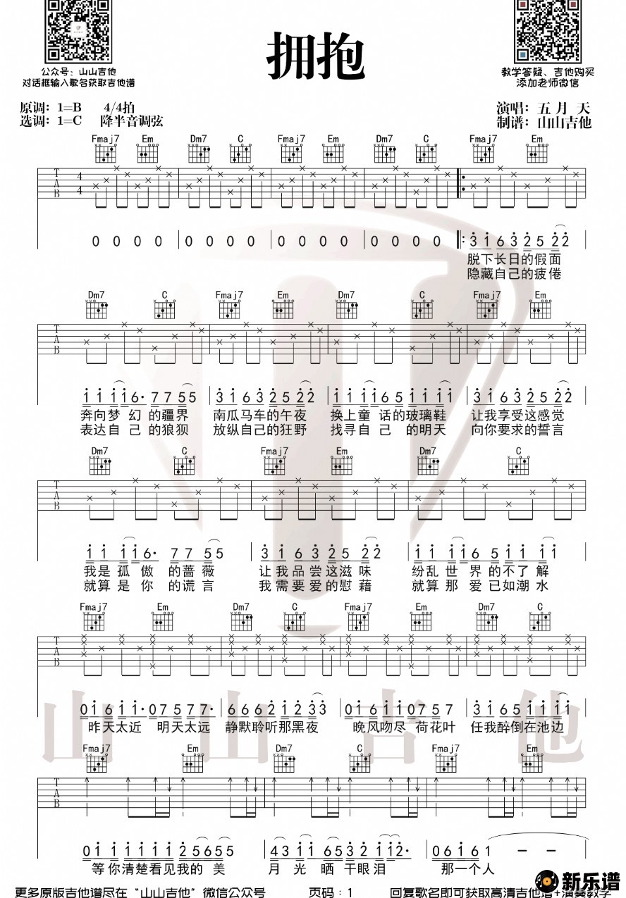 五月天演唱的拥抱歌词,拥抱吉他谱.