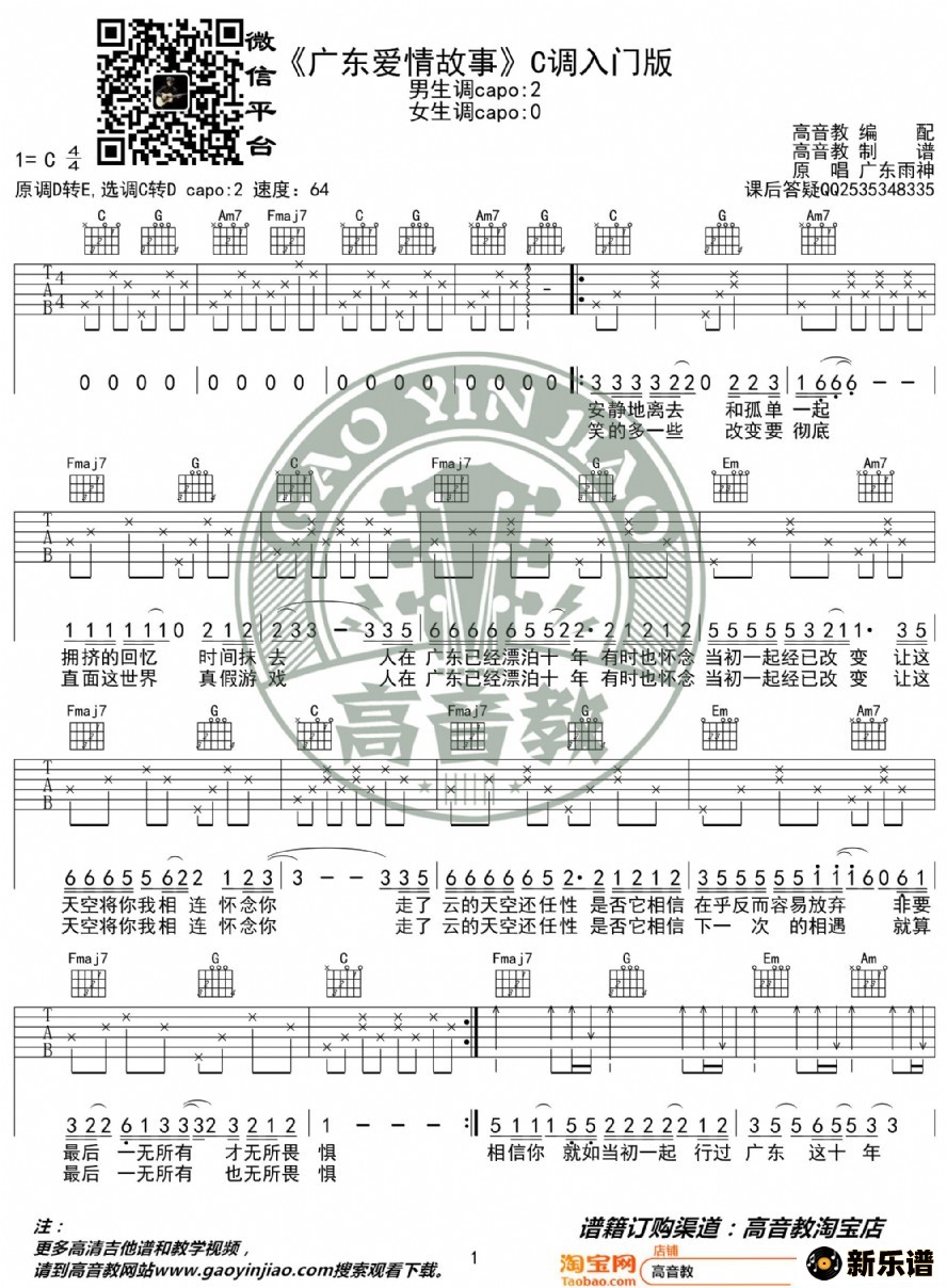 《广东爱情故事》吉他谱c调入门版 广东雨神 猴哥吉他教学 高音教编配/广东雨神 广东爱情故事 相关曲谱