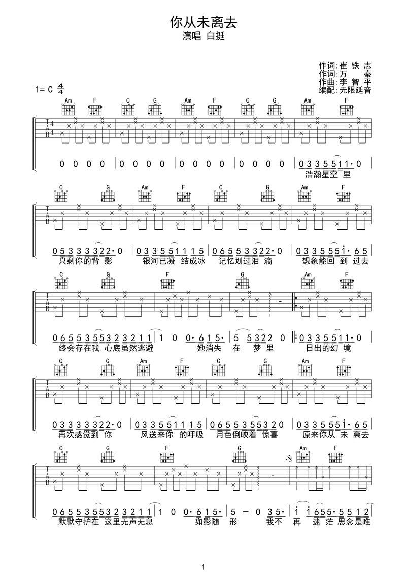 白挺演唱的你从未离去(《熊出没之雪岭熊风》)歌词,你从未离去(《熊出没之雪岭熊风》)吉他谱.