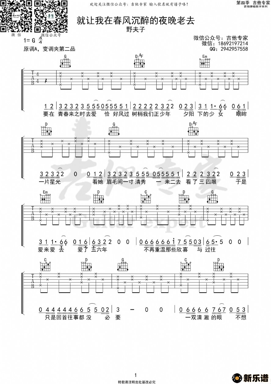《就让我在春风沉醉的夜晚老去》吉他谱 野夫子-吉他专家制谱