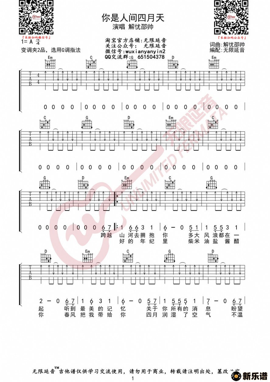 《你是人间四月天 吉他谱》吉他谱 解忧邵帅-无限延音制谱