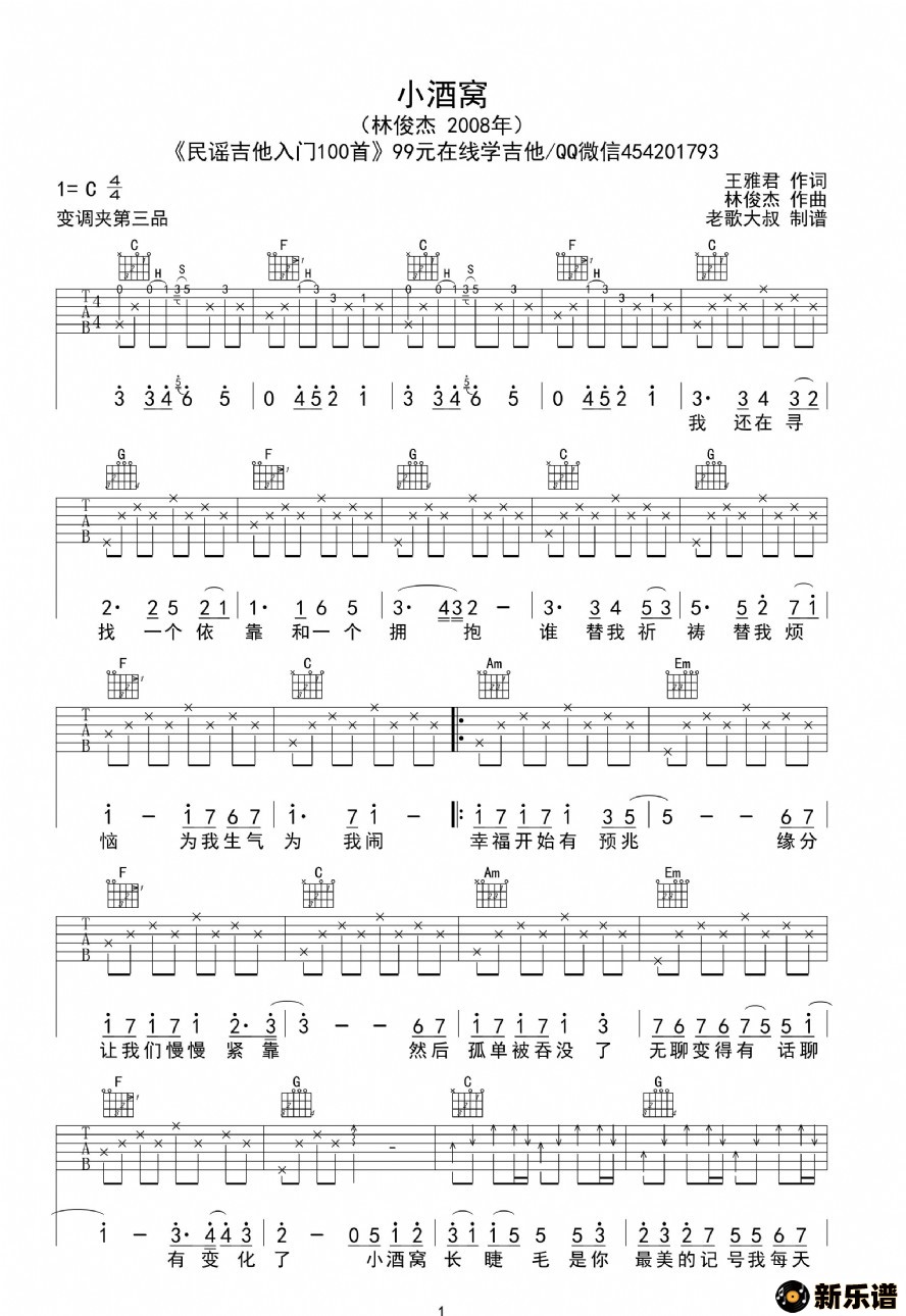 林俊杰演唱的《小酒窝》吉他谱c调简单版歌词,《小酒窝》吉他谱c调简单版吉他谱.