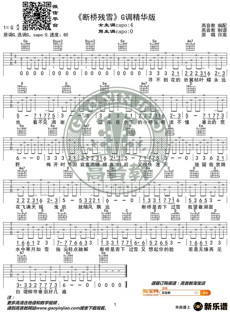 《断桥残雪》吉他谱g调精华版 高音教编配 猴哥吉他教学许嵩 许嵩演唱的《断桥残雪》吉他谱g调精华版 高音教编配 猴哥吉他教学歌词,《断桥残雪》吉他谱g调精华版 高音教编配 猴哥吉他教学吉他谱. 此吉他谱由新乐谱会员 高音教 上传