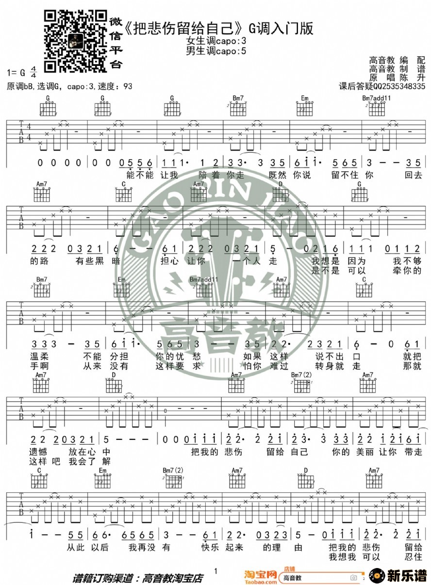 陈升《把悲伤留给自己》吉他谱g调入门版 高音教编配 猴哥吉他教学陈升 陈升演唱的陈升《把悲伤留给自己》吉他谱g调入门版 高音教编配 猴哥吉他教学歌词,陈升《把悲伤留给自己》吉他谱g调入门版 高音教编配 猴哥吉他教学吉他谱. 此吉他谱由新乐谱会员 高音教 上传