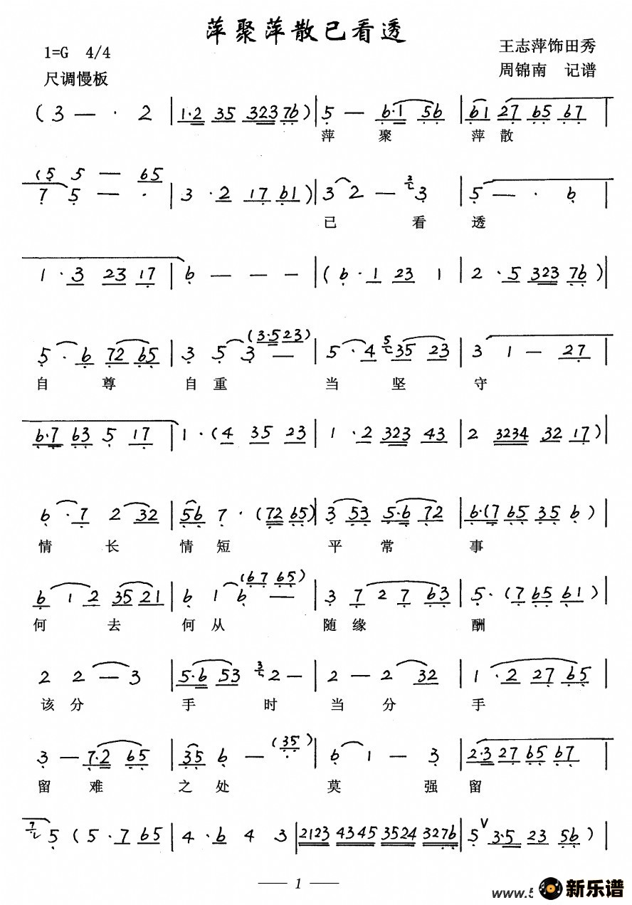 王志萍演唱的萍聚萍散已看透歌词,萍聚萍散已看透最新曲谱.
