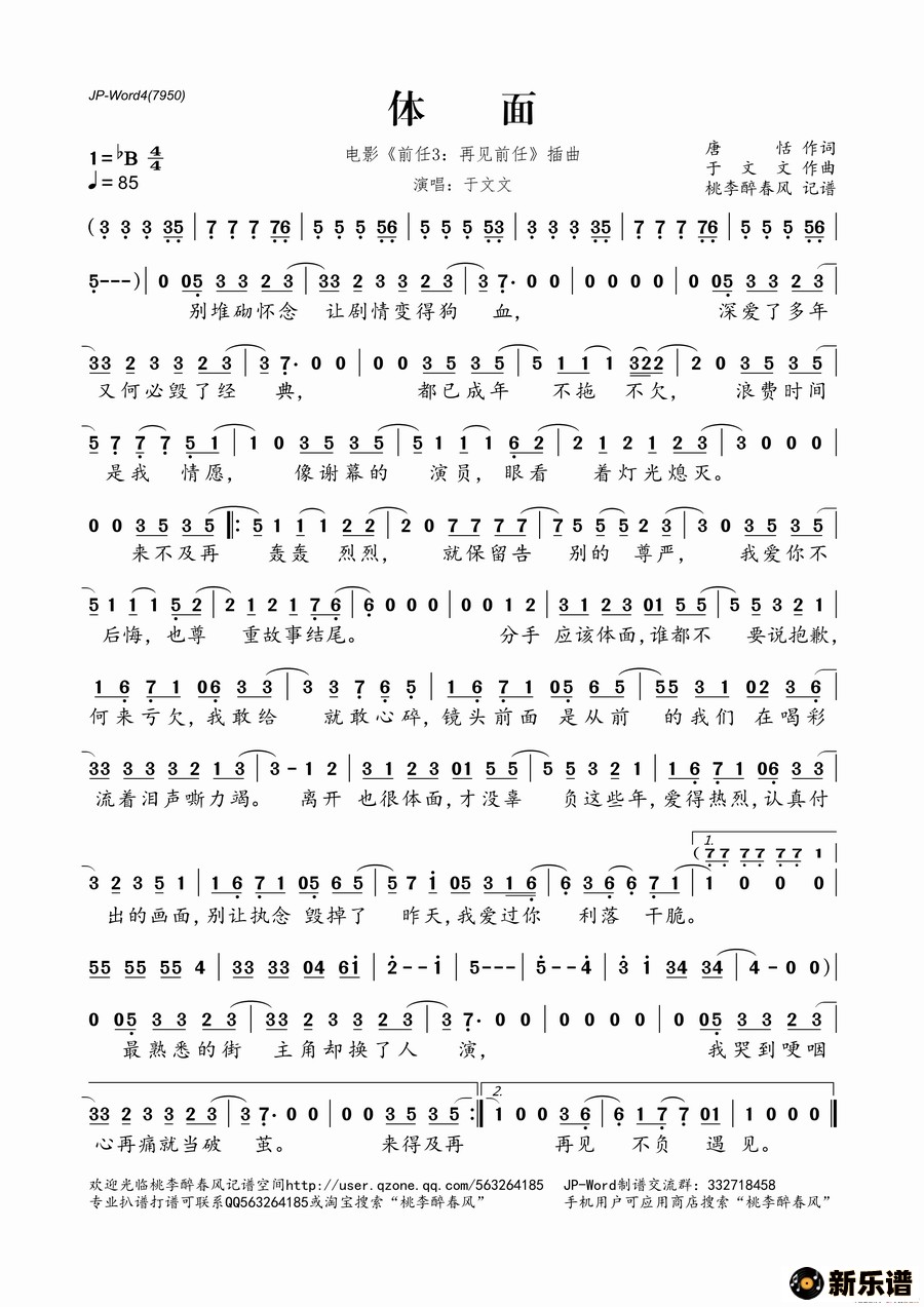 《体面(电影《前任3:再见前任》插曲)》最新曲谱 于文文-桃李醉春风制谱