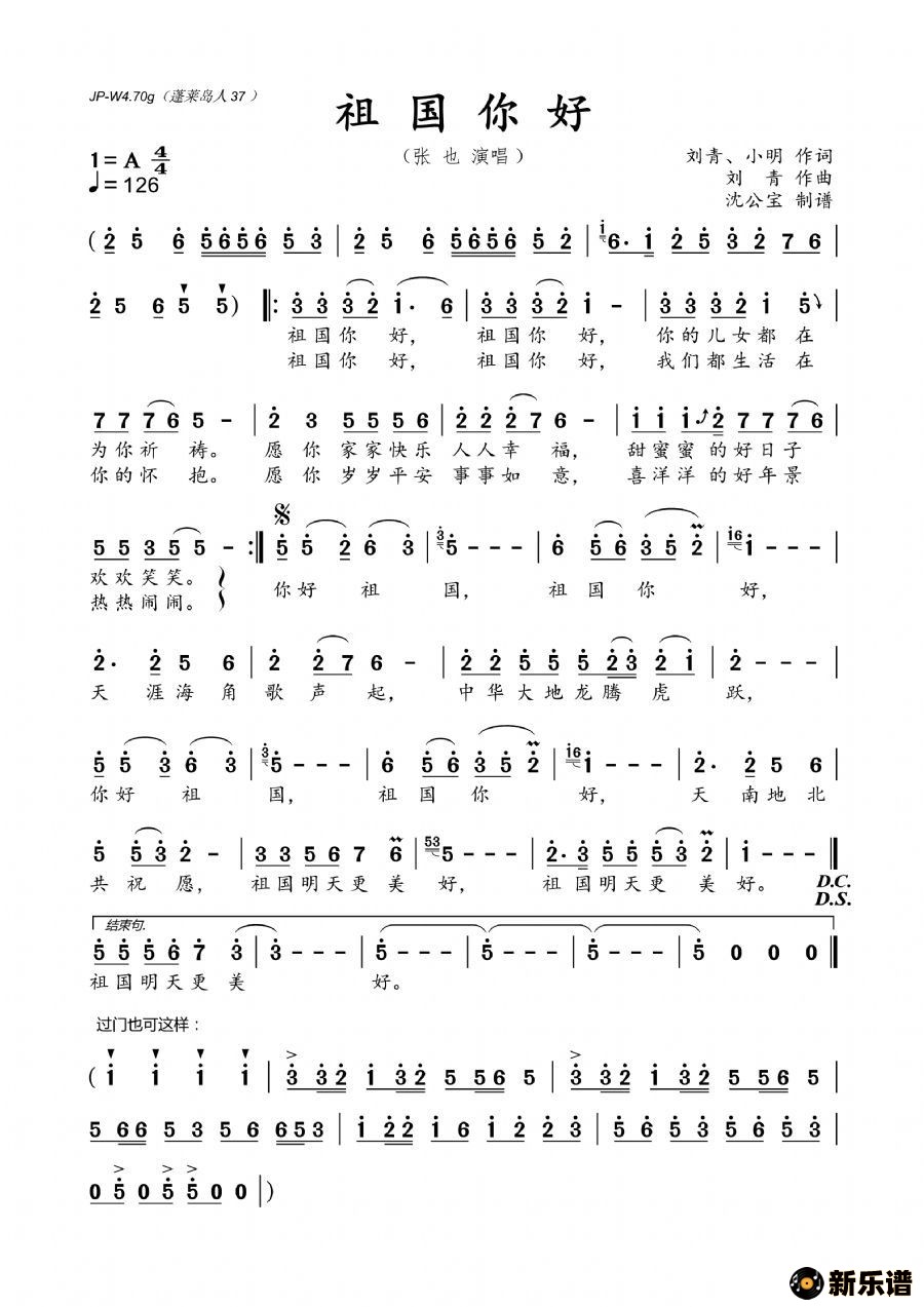 《祖国你好》最新曲谱 张也-沈公宝制谱