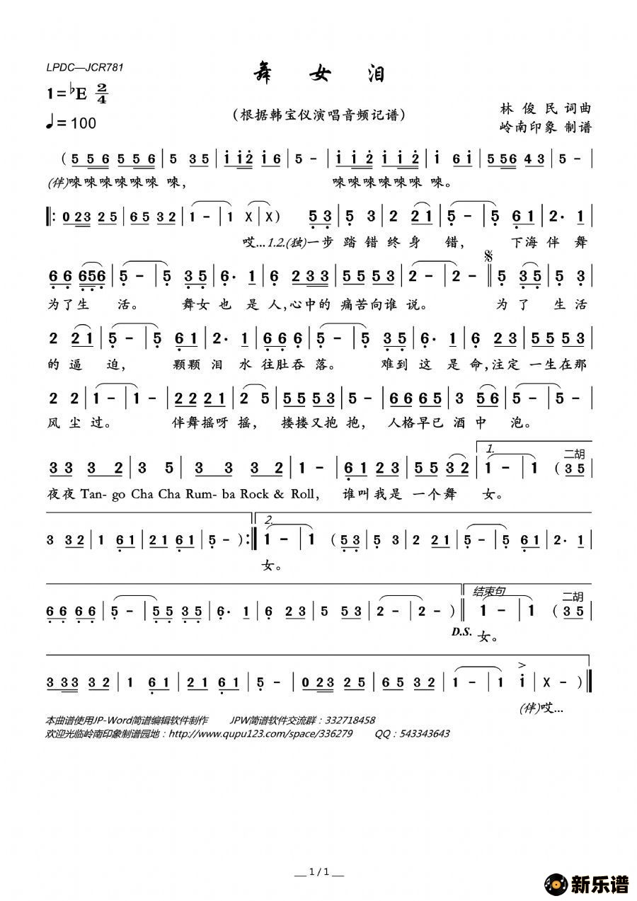 《舞女泪》最新曲谱 韩宝仪-岭南印象制谱