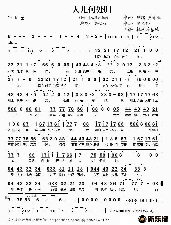 安心亚演唱的人儿何处归歌词,人儿何处归最新曲谱.