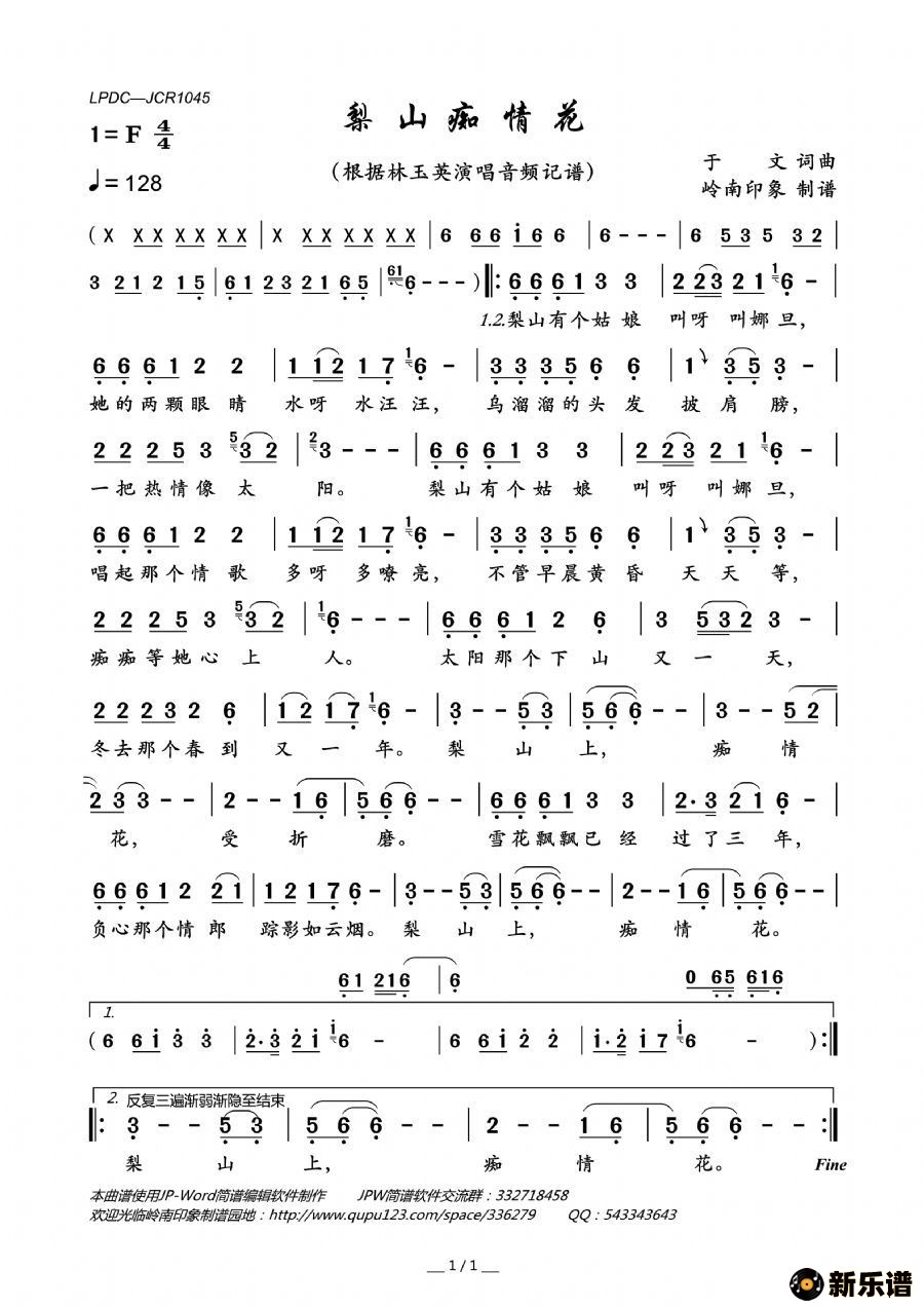 《梨山痴情花》最新曲谱 林玉英-岭南印象制谱
