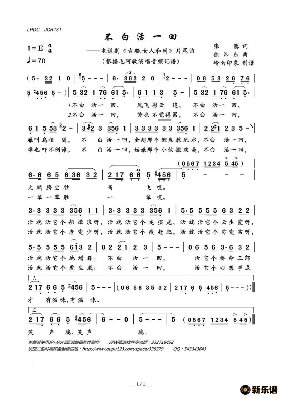 不白活一回(电视剧《古船.女人和网》片尾曲)毛阿敏 毛阿敏演唱的不白活一回(电视剧《古船.女人和网》片尾曲)歌词,不白活一回(电视剧《古船.女人和网》片尾曲)最新曲谱. 此最新曲谱由新乐谱会员 岭南印象 上传