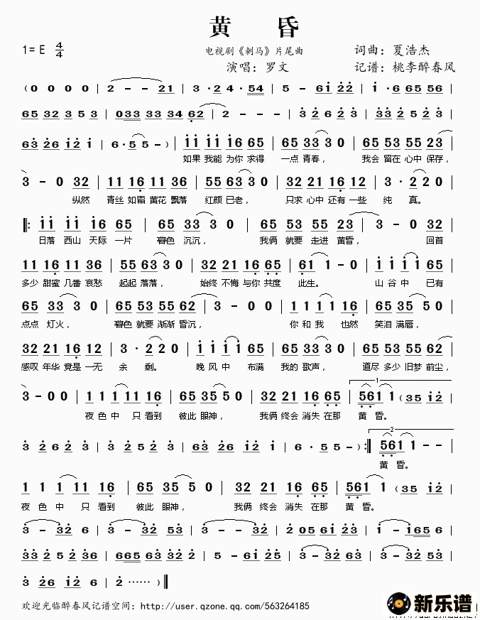 《黄昏(电视剧《刺马》片尾曲)》最新曲谱 罗文-桃李醉春风制谱