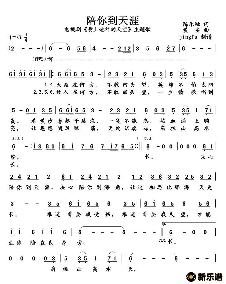 黄安演唱的陪你到天涯(电视剧《黄土地外的天空》主题歌)歌词,陪你到天涯(电视剧《黄土地外的天空》主题歌)最新曲谱.