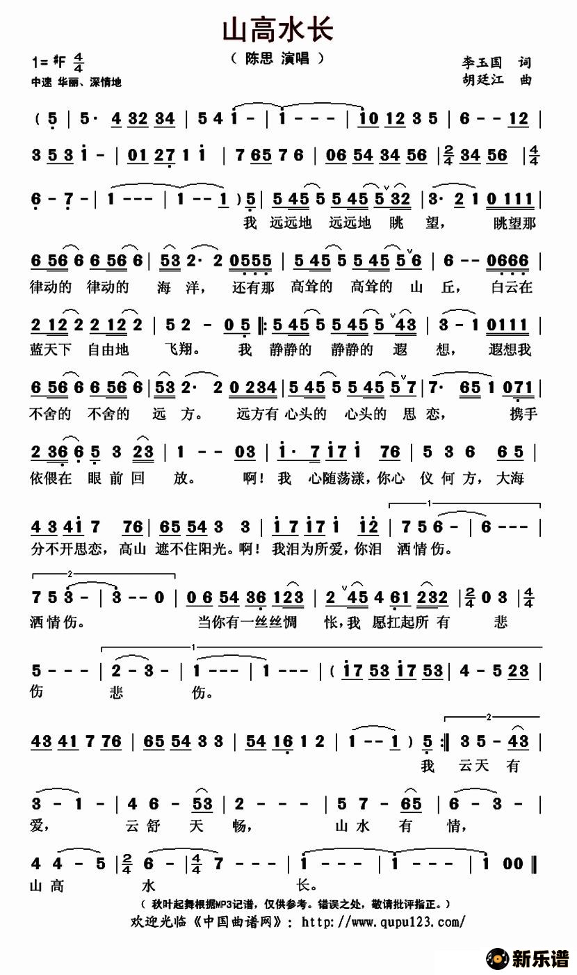 陈思演唱的山高水长歌词,山高水长最新曲谱.