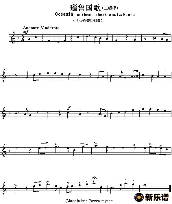 演唱的各国国歌主旋律:瑙鲁歌词,各国国歌主旋律:瑙鲁最新曲谱.