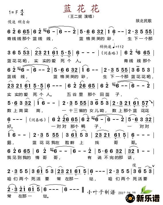《蓝花花》最新曲谱 王二妮-小叶子制谱