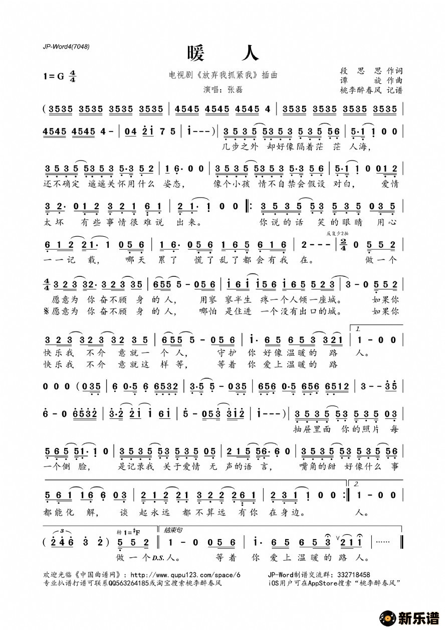 《暖人(电视剧《放弃我抓紧我》插曲)》最新曲谱 张磊-桃李醉春风制谱