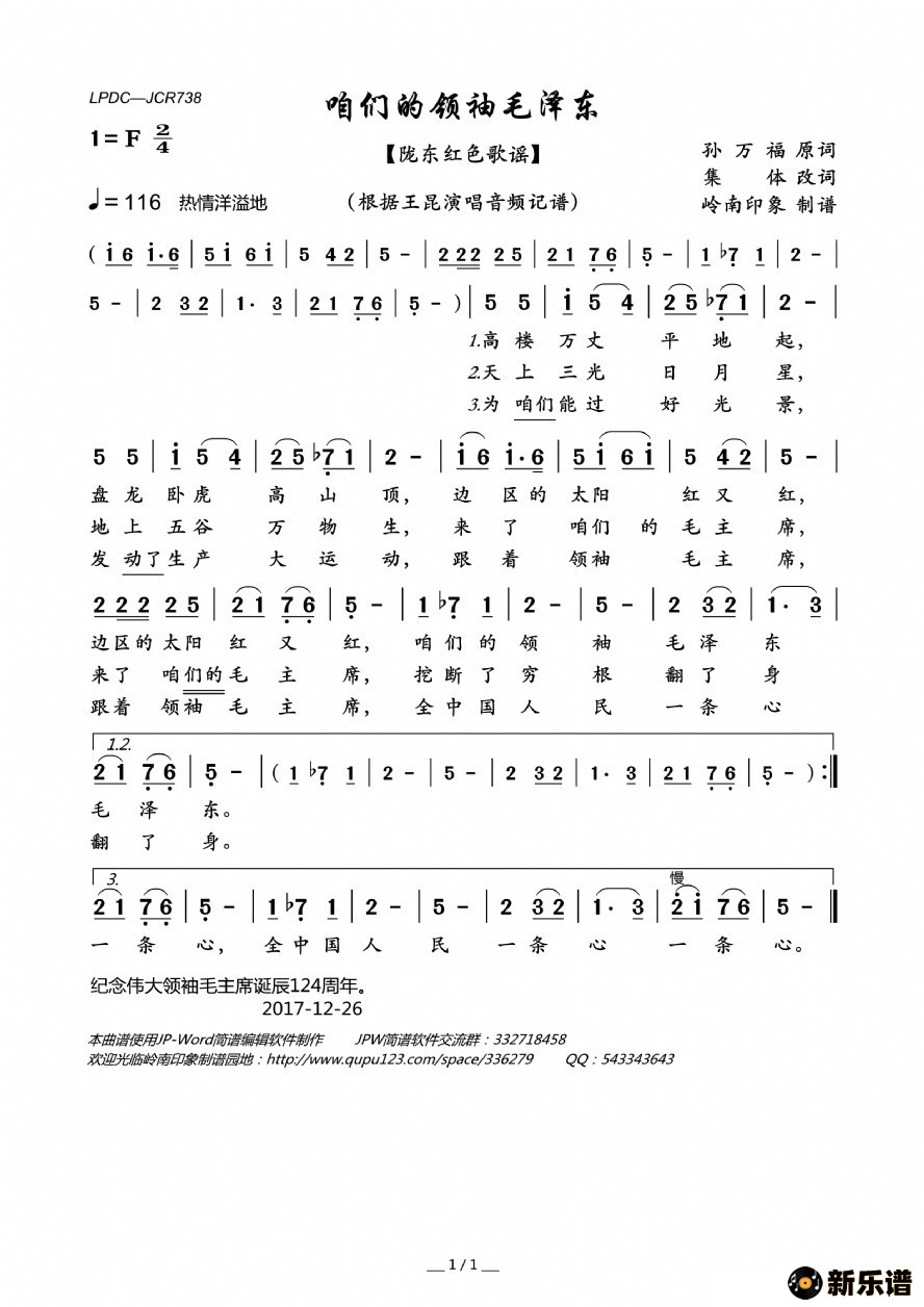 《咱们的领袖毛泽东》最新曲谱 王昆-岭南印象制谱