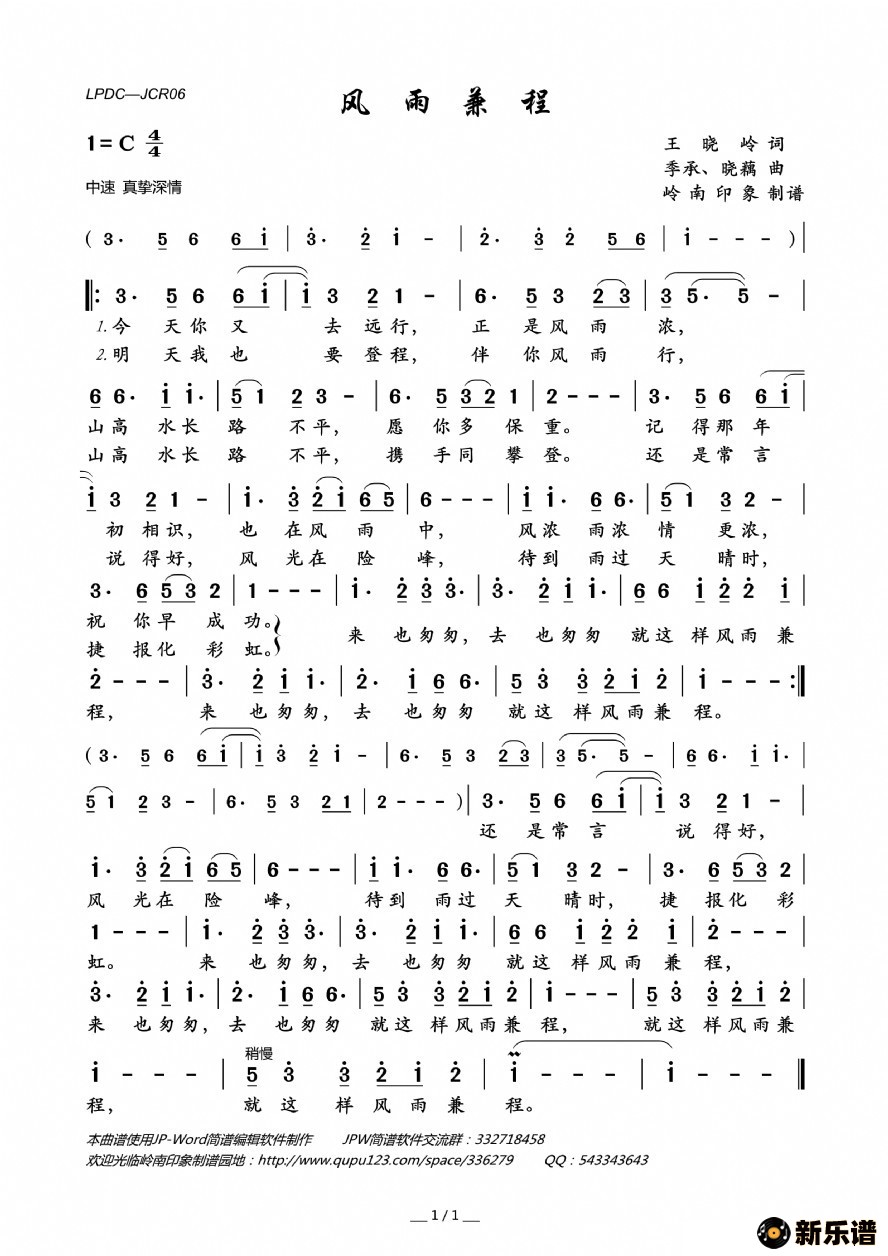 《风雨兼程》最新曲谱 程琳-岭南印象制谱