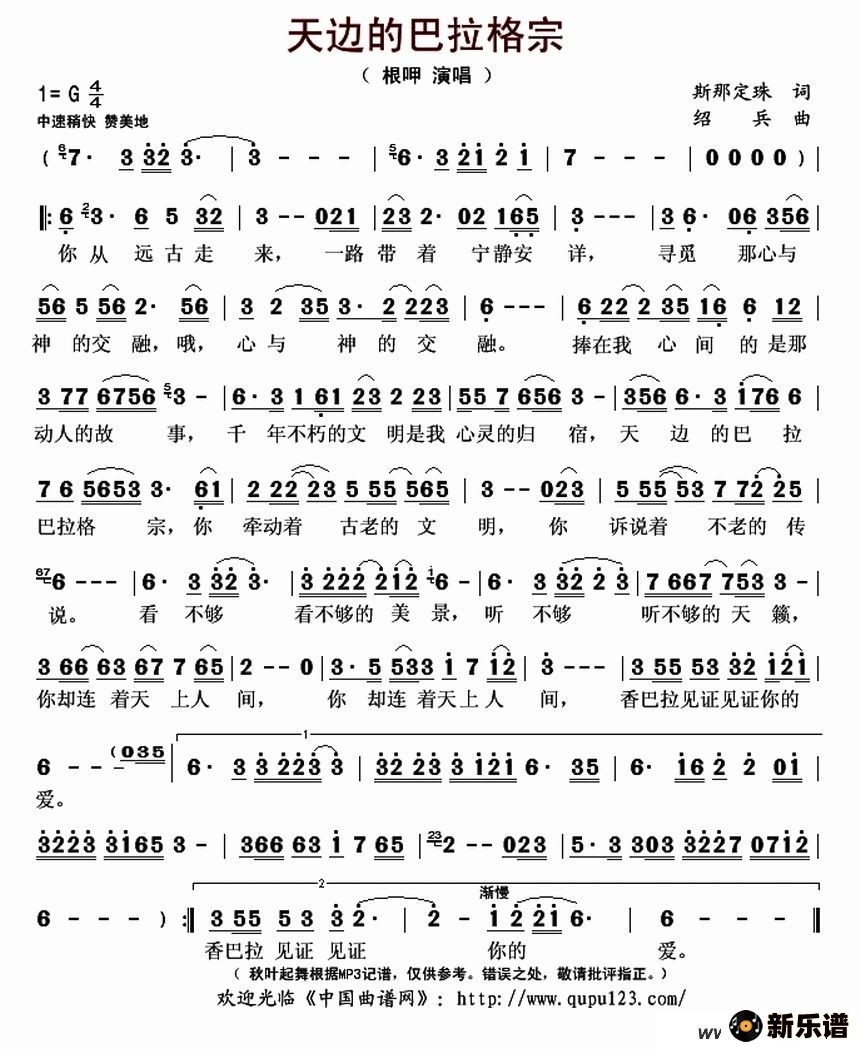 根呷演唱的 天边的巴拉格宗歌词, 天边的巴拉格宗最新曲谱.