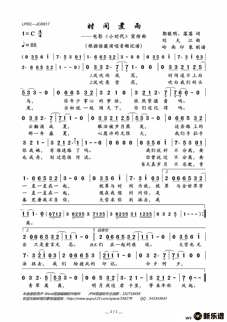 《时间煮雨(电影《小时代》宣传曲)》最新曲谱 徐薇-岭南印象制谱