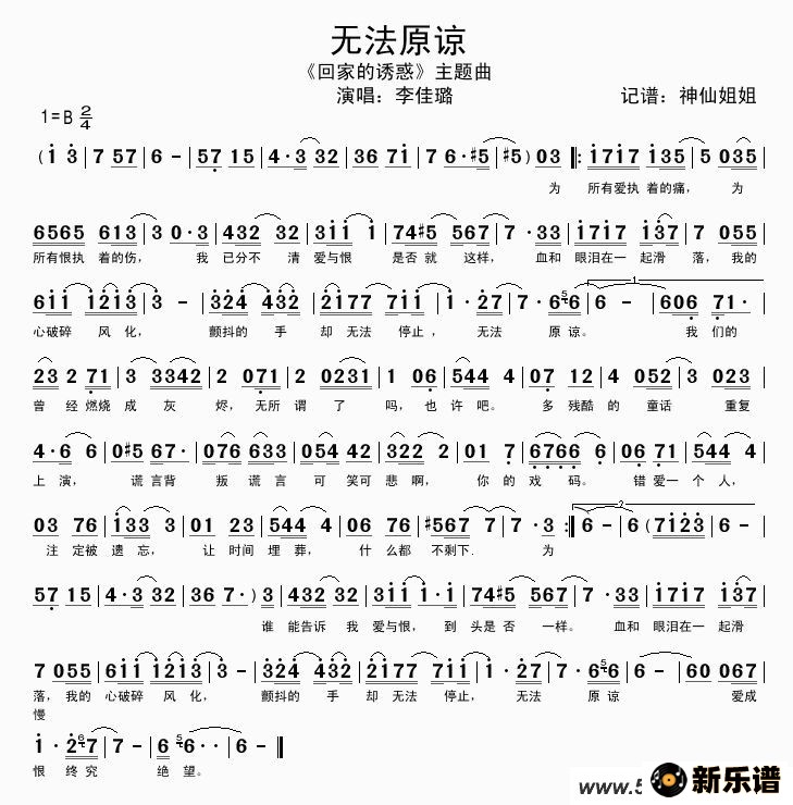 李佳璐演唱的无法原谅(电视剧《回家的诱惑》主题曲)歌词,无法原谅(电视剧《回家的诱惑》主题曲)最新曲谱.