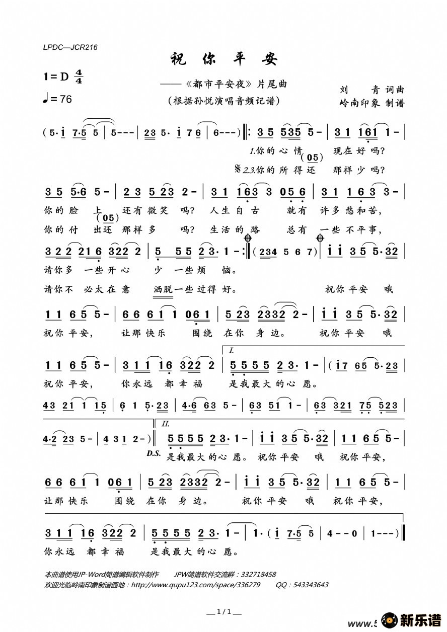 《祝你平安》最新曲谱 孙悦-岭南印象制谱