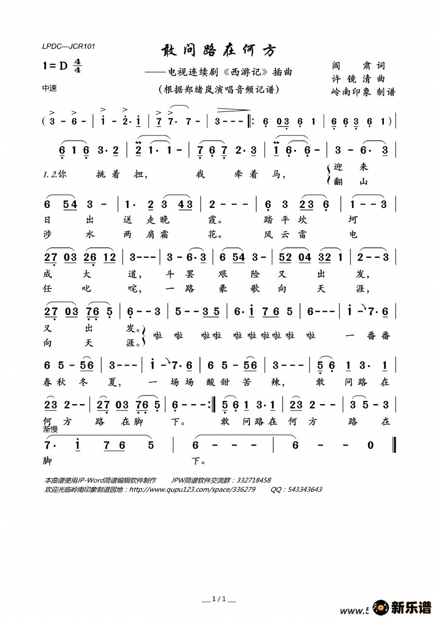 《敢问路在何方(电视连续剧《西游记》插曲)》最新曲谱 郑绪岚-岭南印象制谱